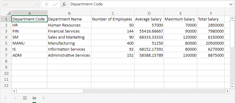 resultColumnCaptions = { "Department Code", "Department Name", "Number of Employees", "Average Salary", "Maximum Salary", "Total Salary" },