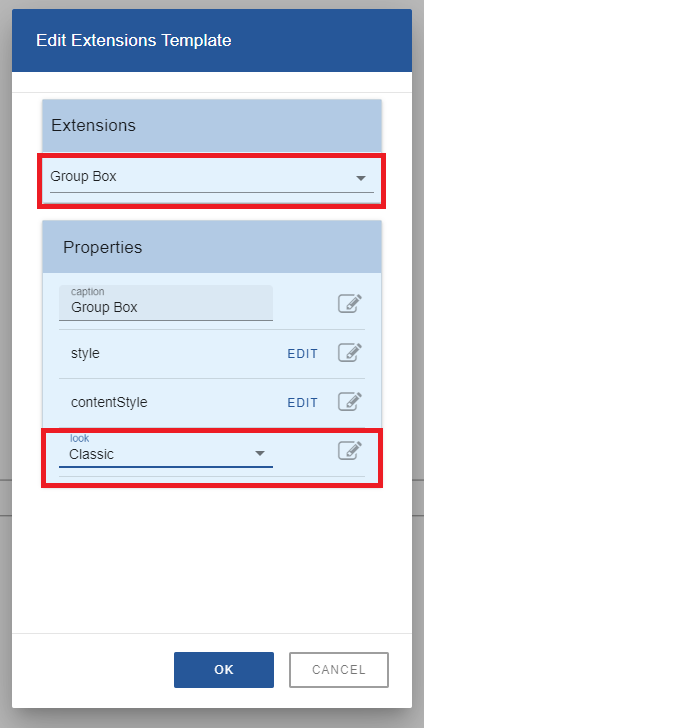 2.       Edit Extensions Template window will appear. showing customizable eXtensions and a property sheet showing their current default values. Select Group Box in the drop down. Change the “look” property from ”Classic” to “Modern”. Click Ok button to close the window.
