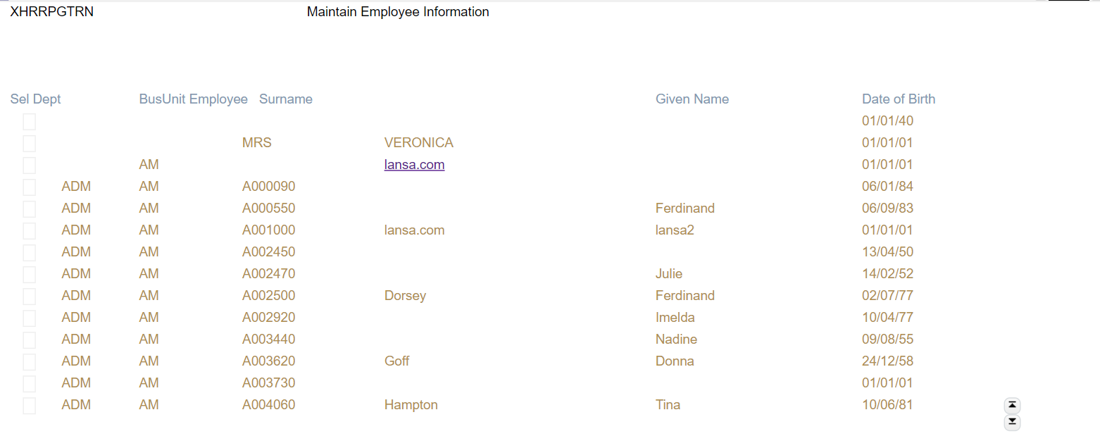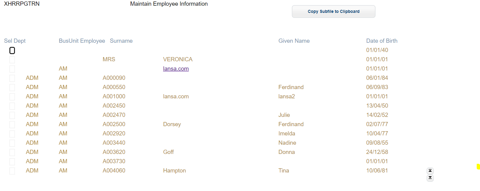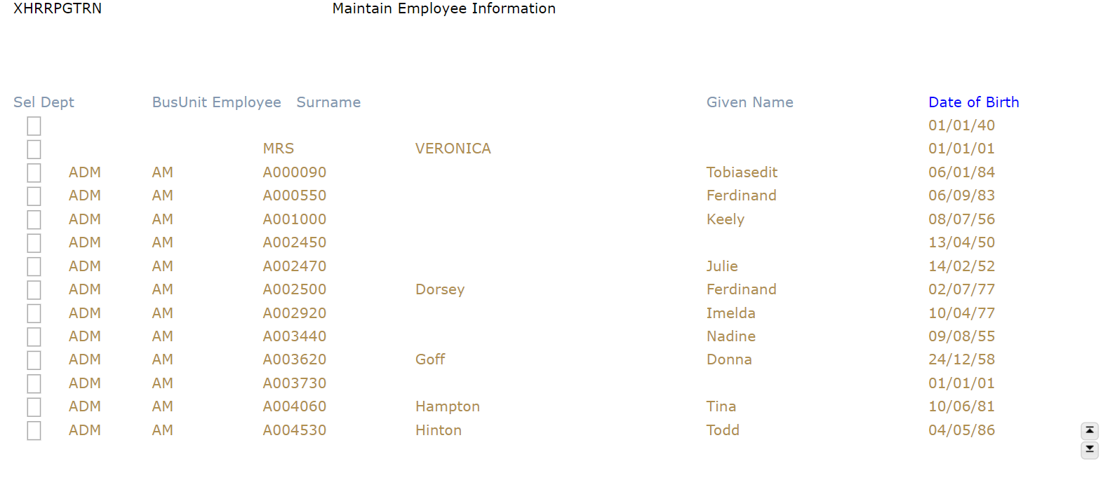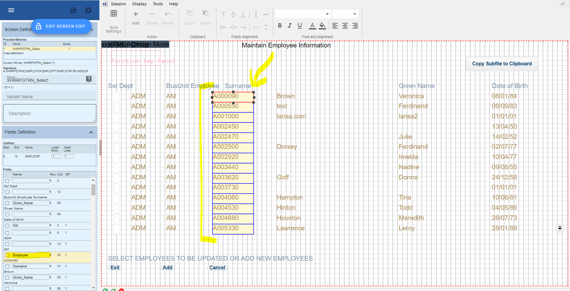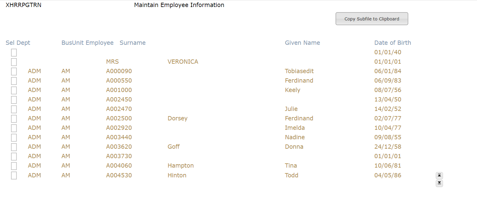 The Maintain Employee Information subfile identified as screen XHRRPGTRN_Select.