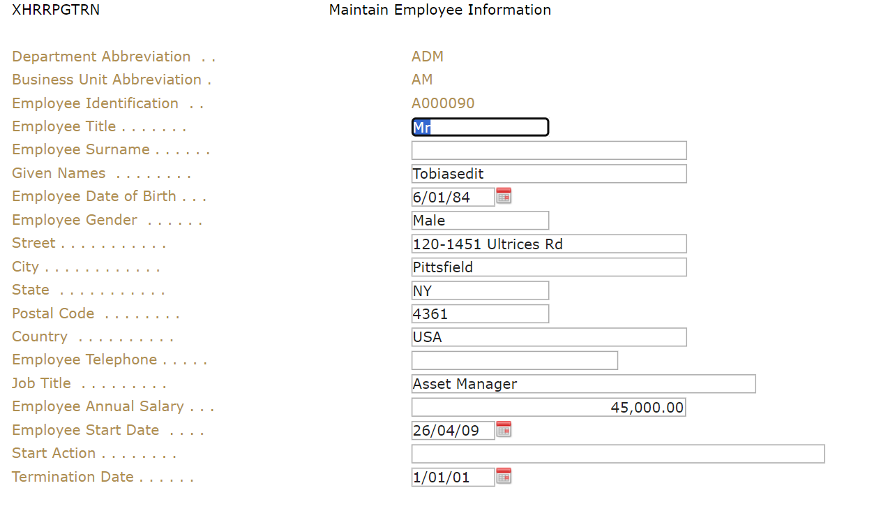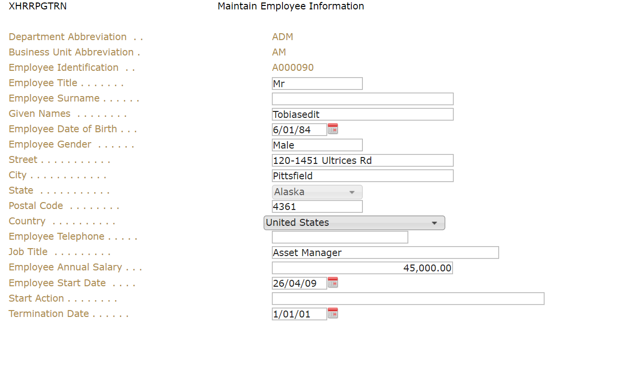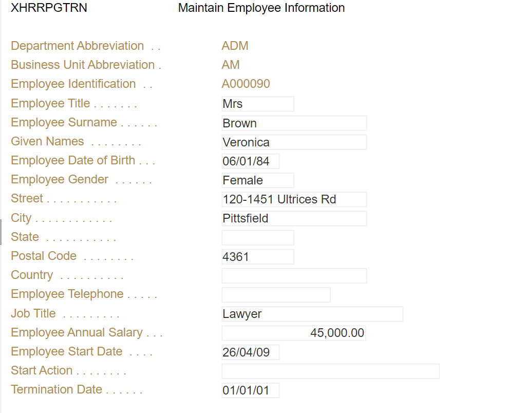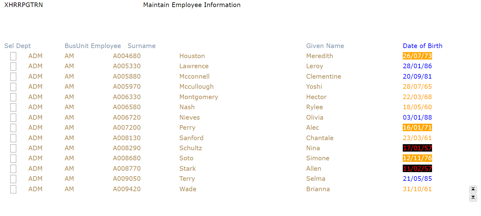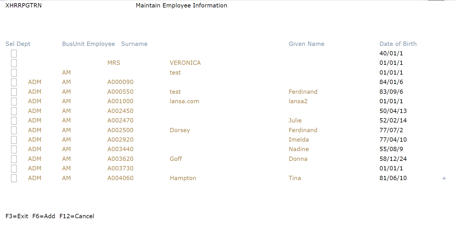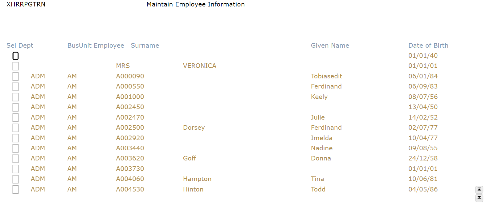 The Maintain Employee Information subfile identified as screen XHRRPGTRN_Select.