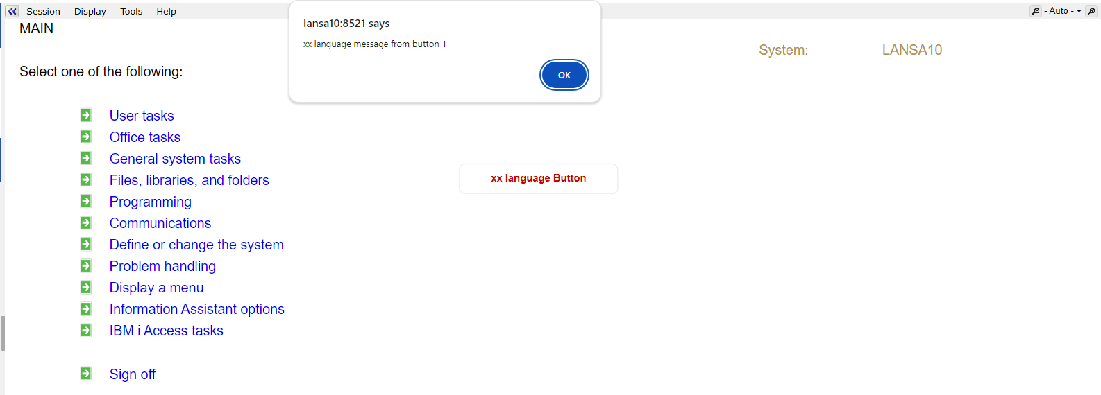 A push button is added to the MAIN screen. When axes is run in the default language or with &lang=en added to the url, the button caption and the alert issued by clicking the button use english captions.