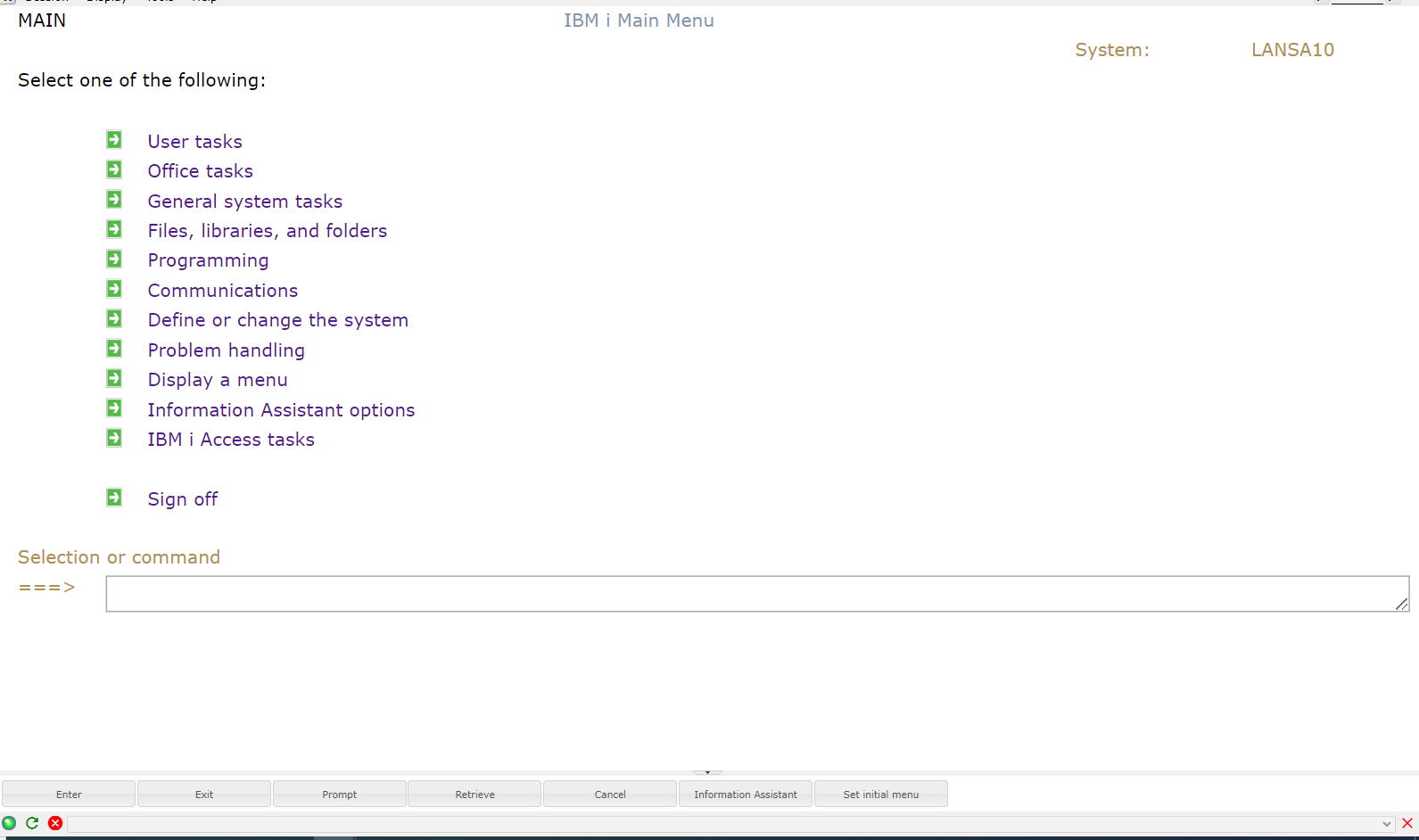 The System i Main Menu, identified as screen MAIN, with the entry field named CommandLine: