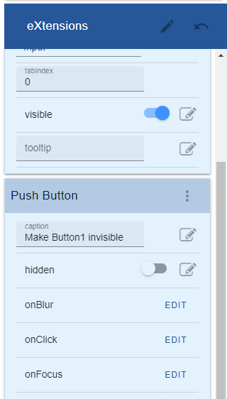 For example, a script under a certain condition needs to hide another element named "AdditionalDetails". We can do this by setting the visible property of the element to false (visible property can be found in the property sheet under Basic Properties).