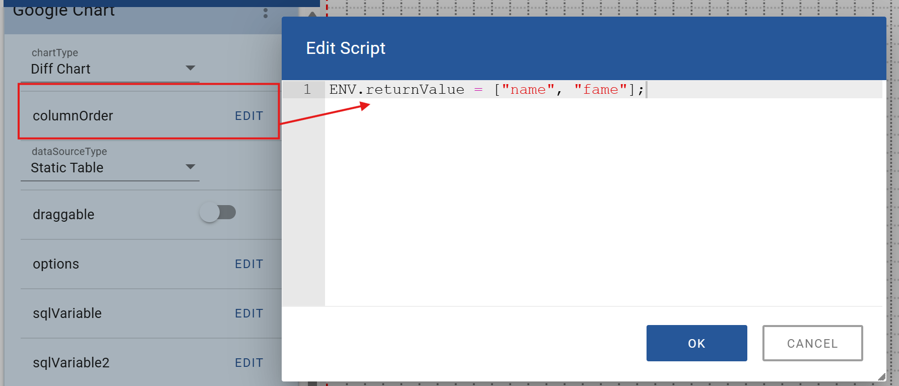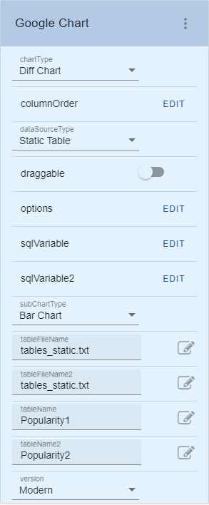 https://developers.google.com/chart/terms Google Array Format https://developers.google.com/chart/interactive/docs/datatables_dataviews#arraytodatatable DataTable Scripting https://developers.google.com/chart/interactive/docs/datatables_dataviews#emptytable draw() API https://developers.google.com/chart/interactive/docs/drawing_charts#chart.draw computeDiff() API