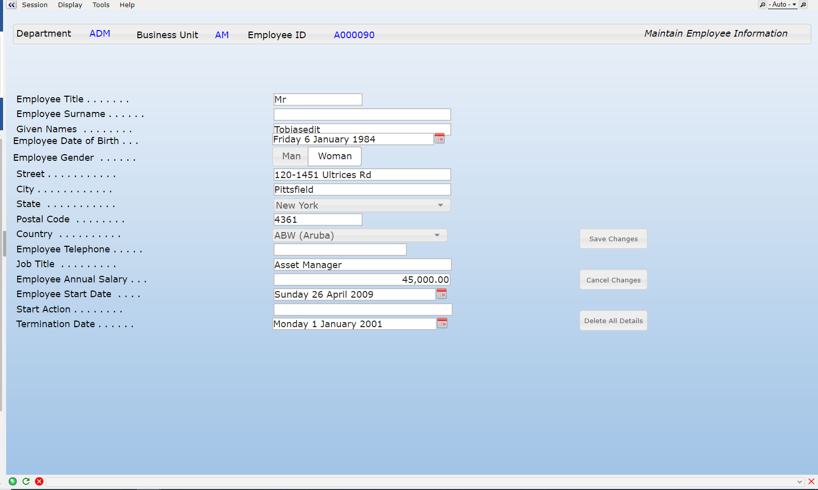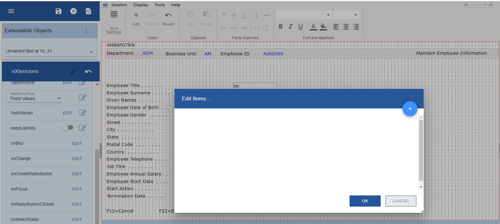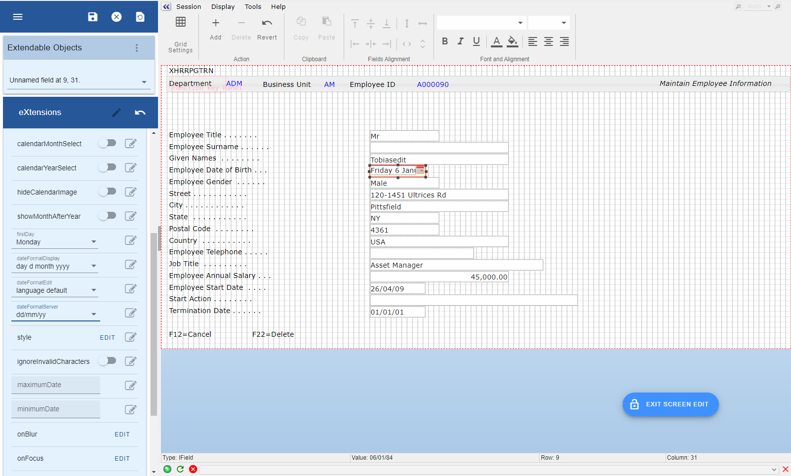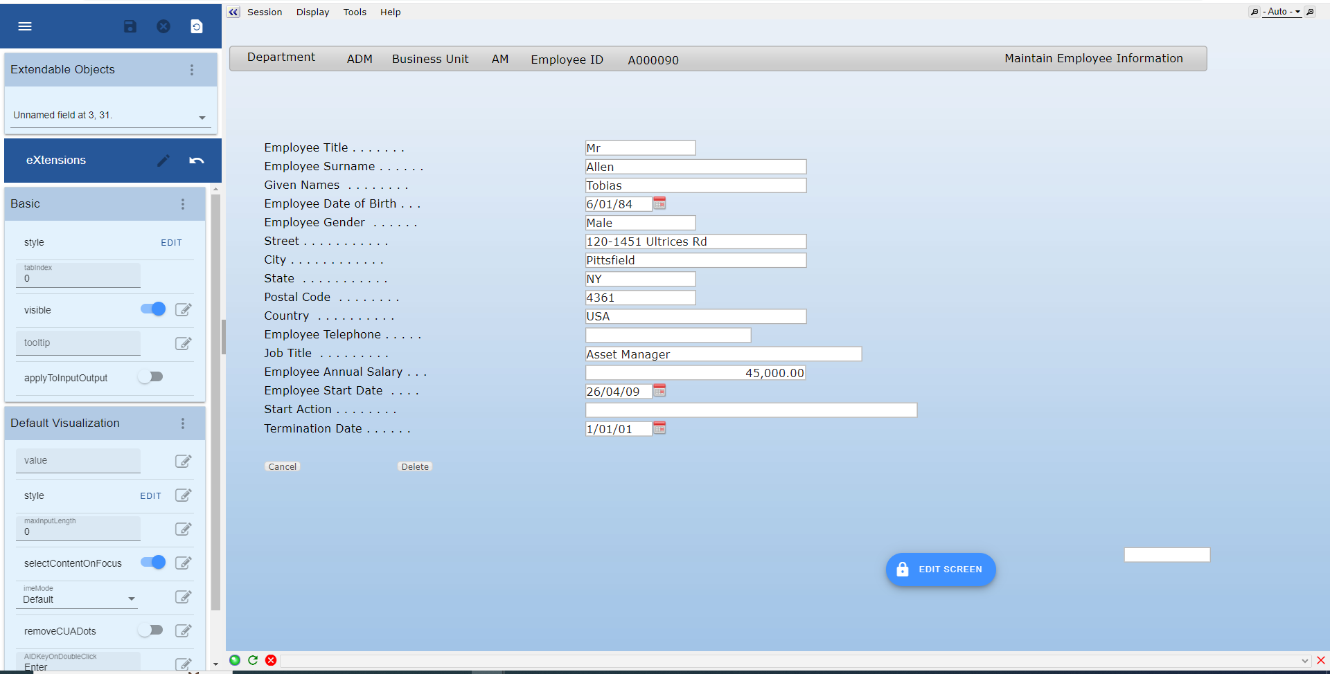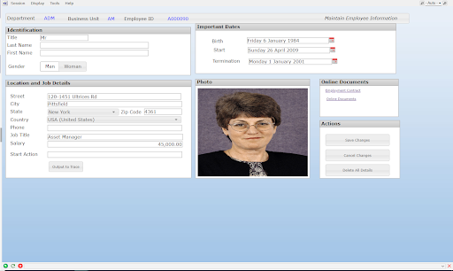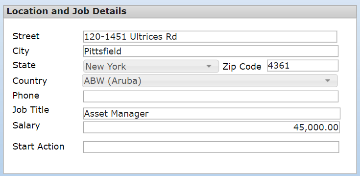 Move these fields into the group box: Street City State Zip (Postal Code) Country Phone (Employee Telephone) Job Title Salary (Employee Annual Salary) Start Action |