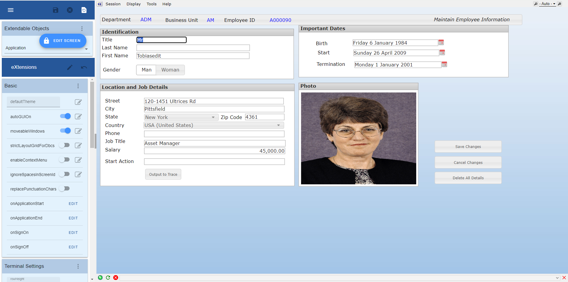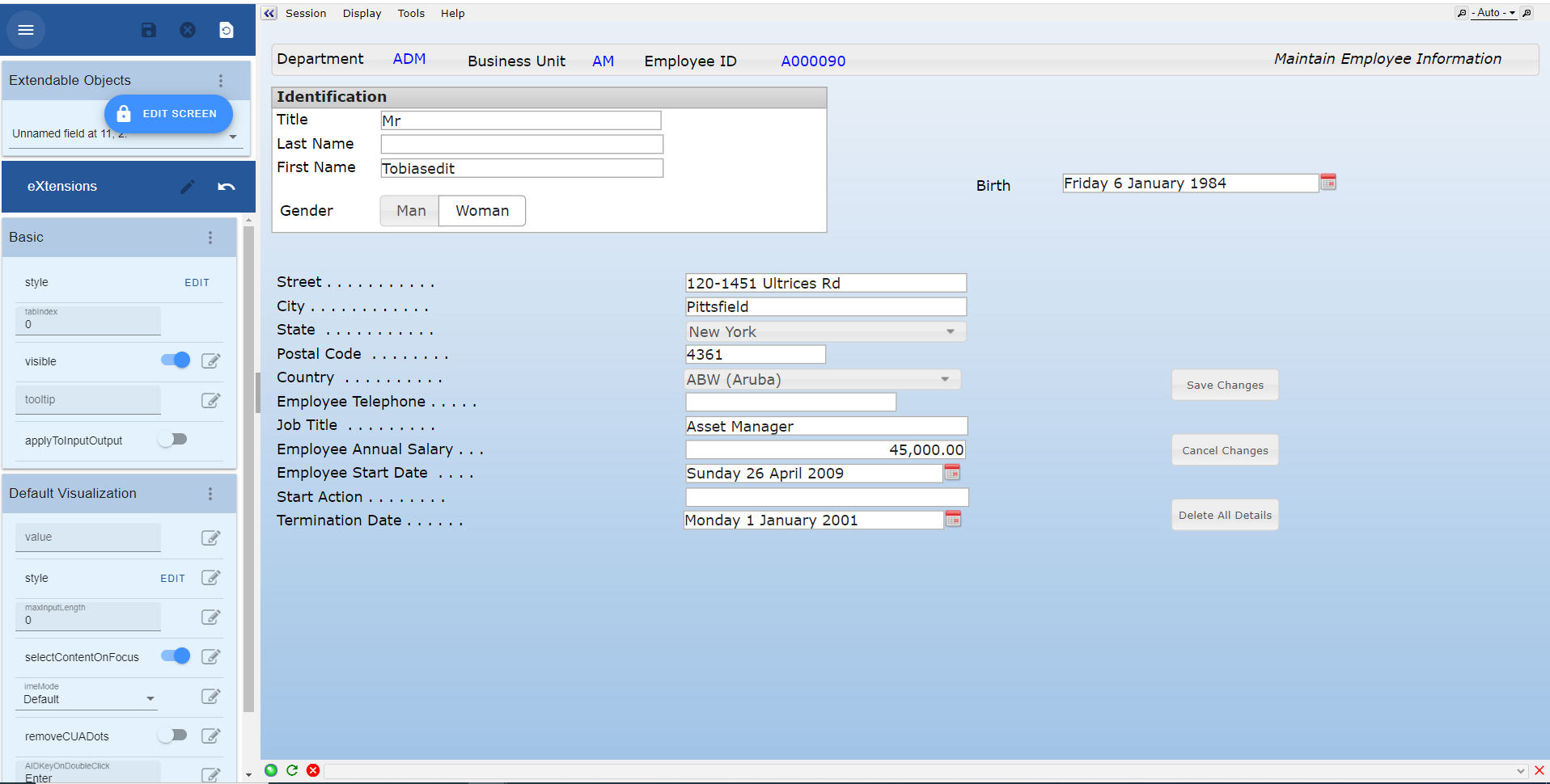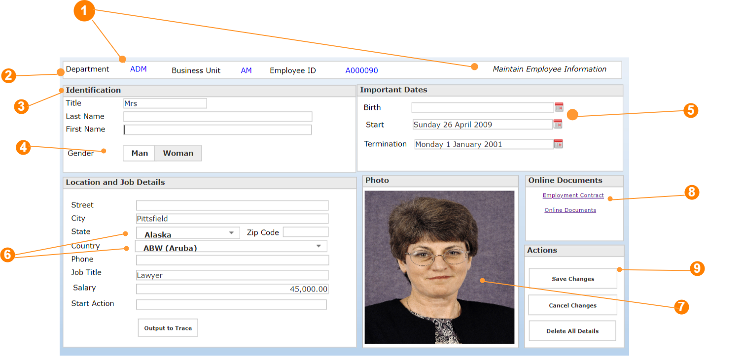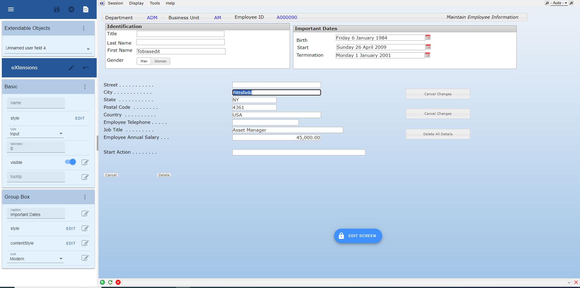 The customization will add these visual and functional eXtensions to the screen: styles, a stripe, date pickers, a radio button, drop downs, buttons, group boxes, an image, and hyperlinks.