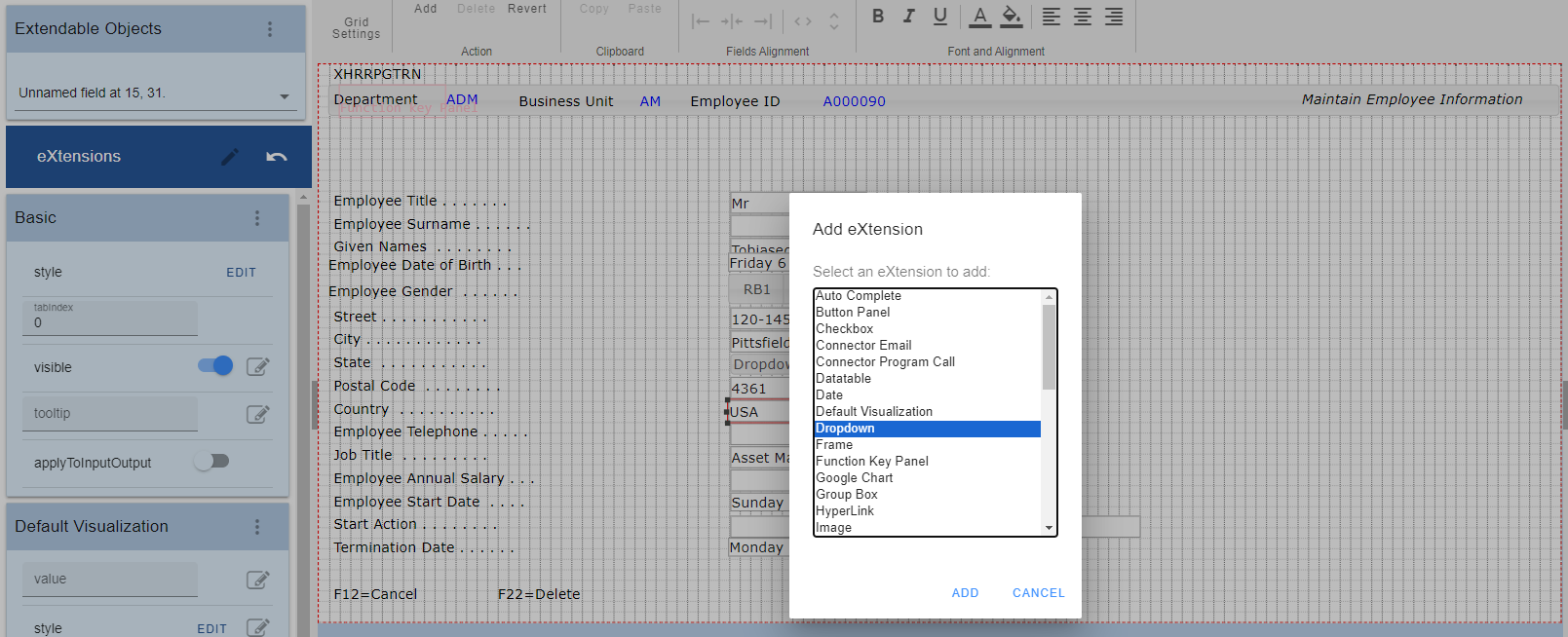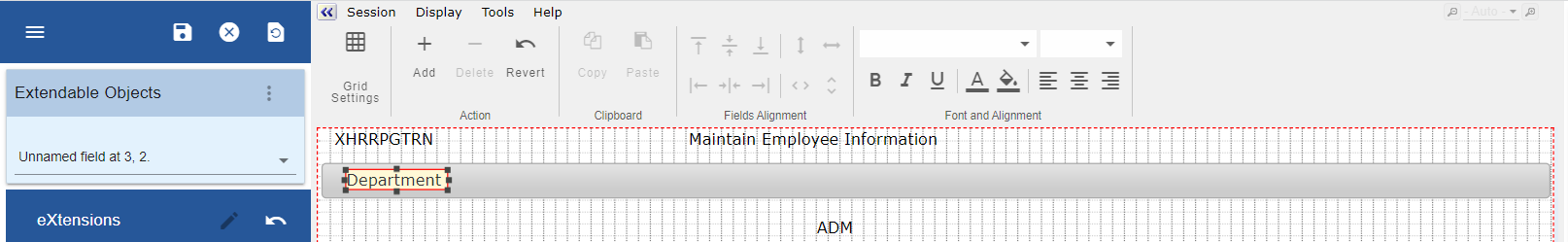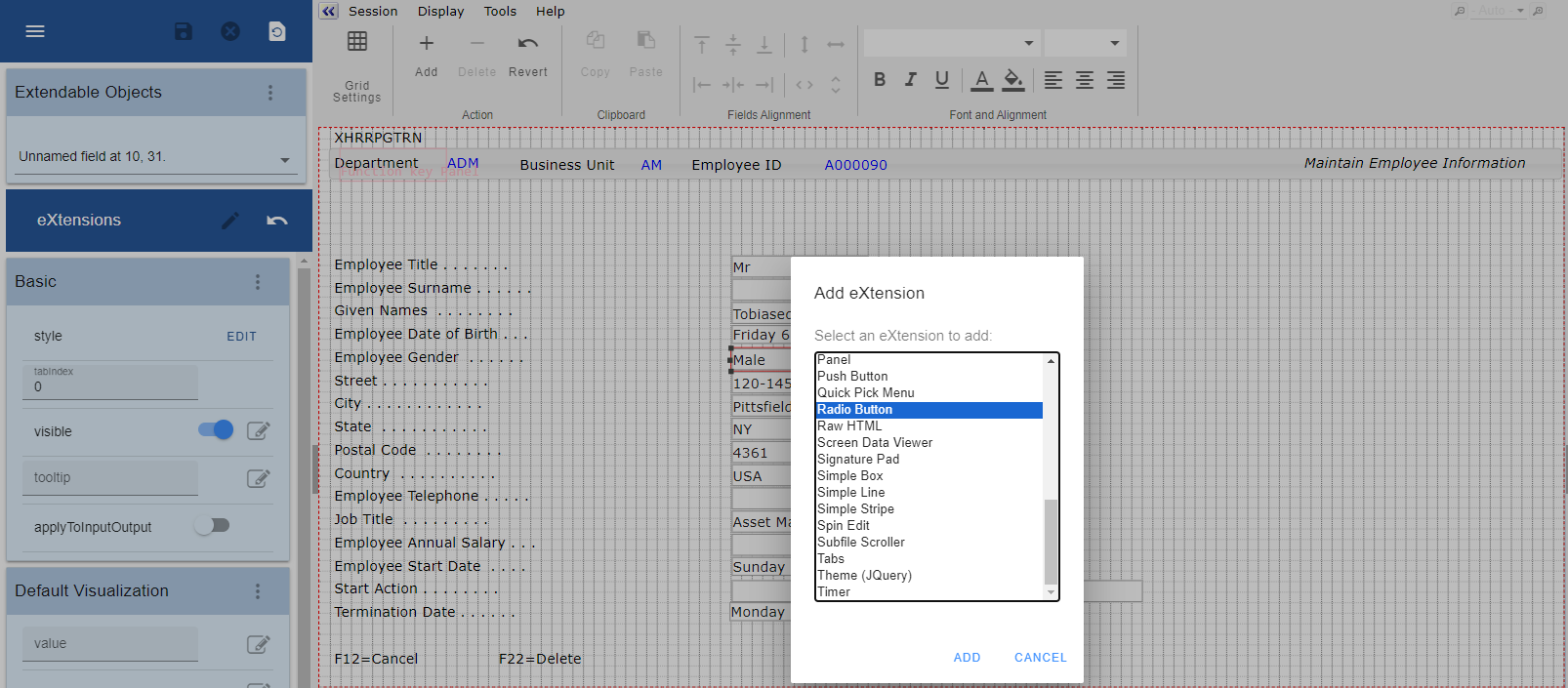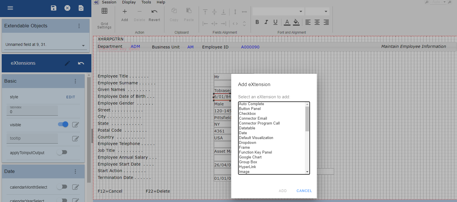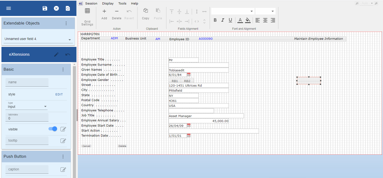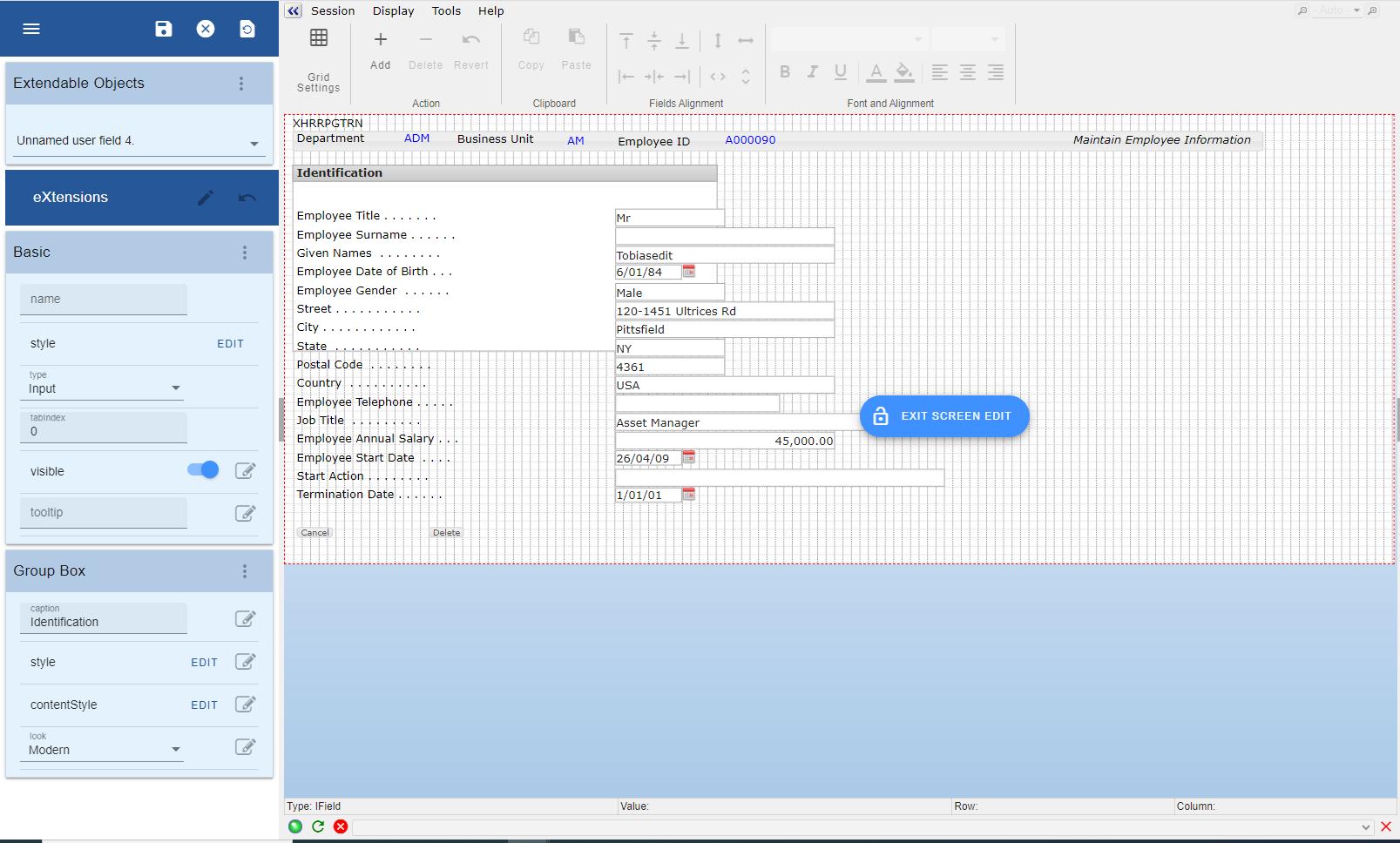 With the aXes Developer window and the XHRRPGTRN_Maint screen displayed, select Group Box from the Extension Toolbox then drag and drop it onto the screen panel.