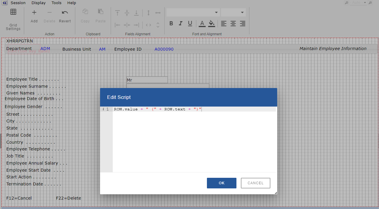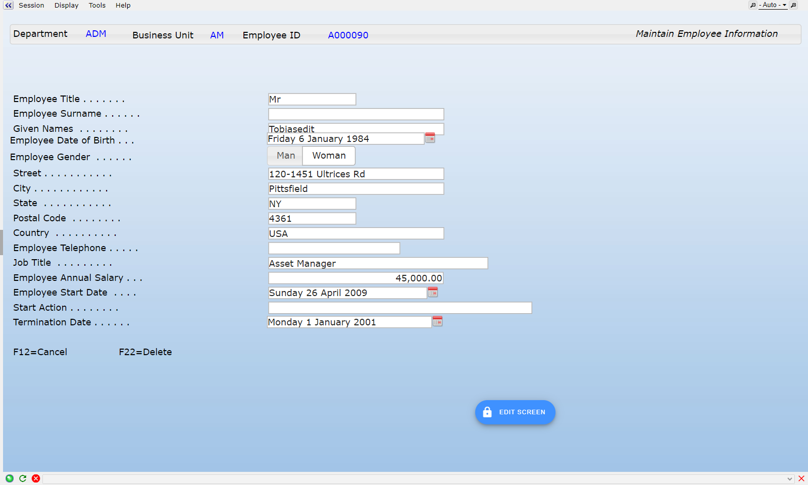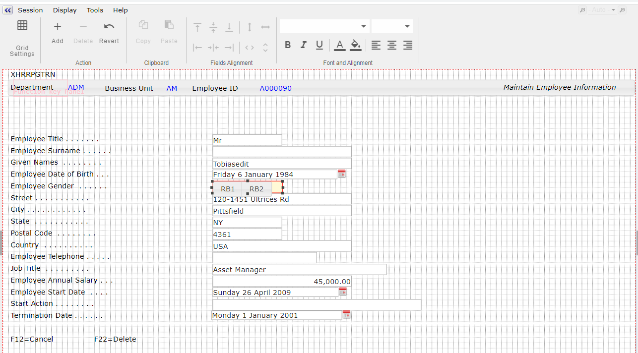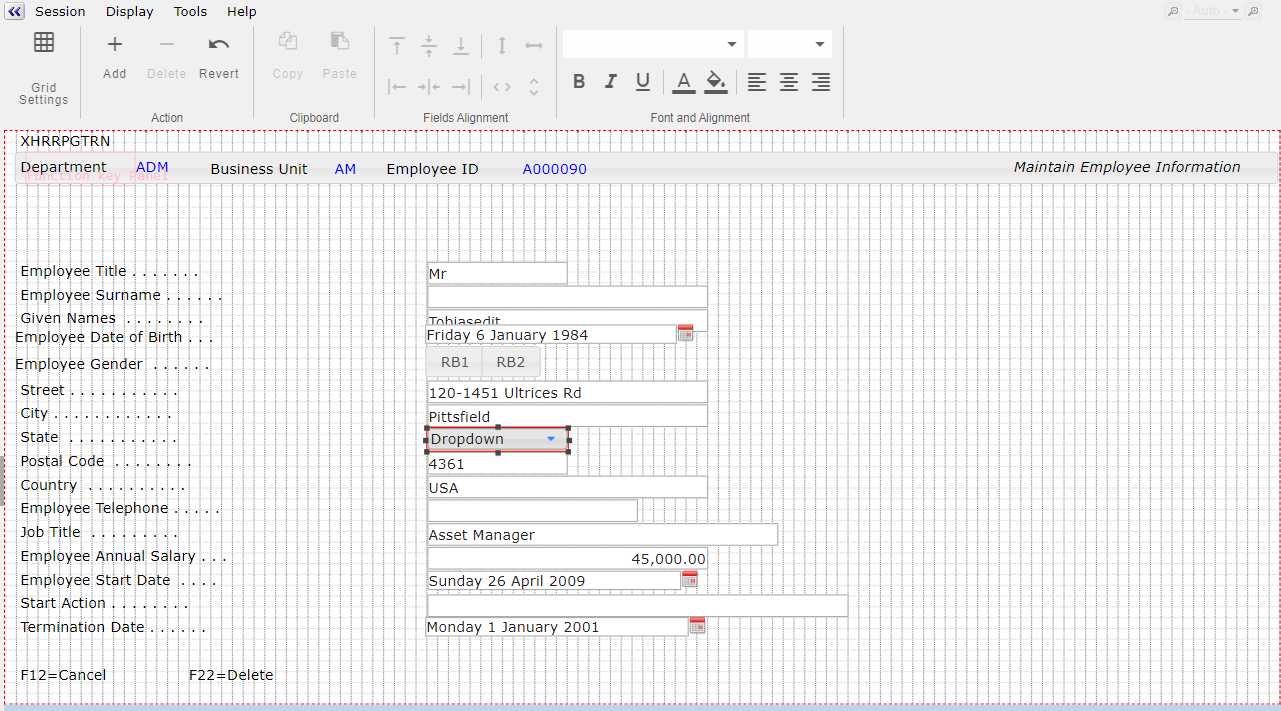 The F12=Cancel and F22=Delete text at the bottom of the 5250 screen is screen text, just like the text "Employee Title". There is nothing special at all about this text. Its presence or absence in no way influences what function keys are actually enabled by the screen.