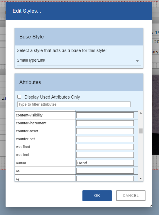 Input the following into the Edit Styles window, then click OK: cursor: Hand