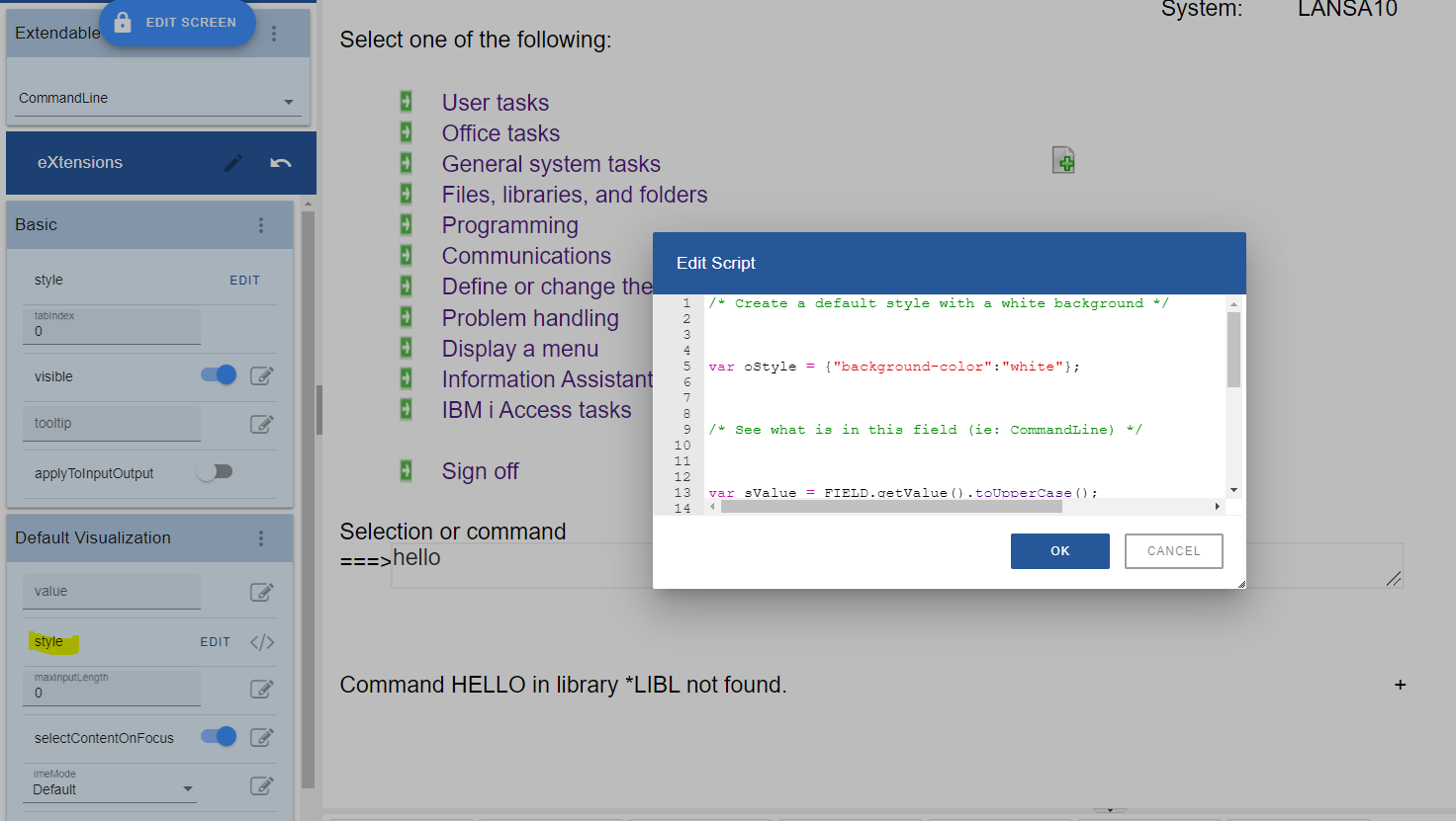 Next they get a reference to the field CommandLine on the screen and alter its style (in fact the style of axdv - its default visualization).